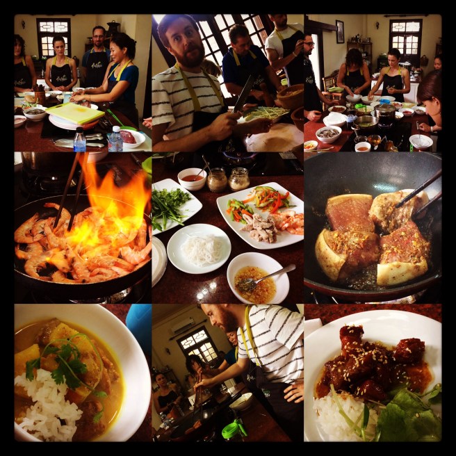 We started our food journey in Hoi An with a fabulous cookery class, with the equally fabulous Van. Meeting just outside the market, donned with traditional Vietnamese conical hats we entered the market with our guide, as we weaved through the stalls she pointed out all the local delicacies, introduced us to her favourite vendors and of course brought everything she needed for the cooking class – talk about farm to table…. this was going to be one fresh meal. Jumping into her mini van we headed to Van’s house, located in the suburbs, she had transformed her kitchen into a great cookery school. The class was full with 12 people, an international group, this was going to be a fun day at the Green Bamboo Cookery School. It was a very hot day but once we got going you barely noticed. Each person had pre picked a dish to make – this was going to be a 10 course lunch! Van went through each dish, pointing out the importance of the herbs and spices and their importance to Vietnamese cuisine. Each person prepared and made their own dish, and it was a mighty feast – a real mix of the simple to the more complex – we got a great over view of Vietnamese cuisine.