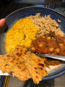 We are currently in operation eat the freezer. This is our attempt to eat all the freezer stuff to clean it out so we can defrost it. There are things in there we had forgotten about, like scones, yum! So tonight was veggie curry and to go with it I made some gram flour parathas from a recipe Romy Gill posted. They were super easy to make and actually quite tasty. Some have gone in the freezer for a future dinner.