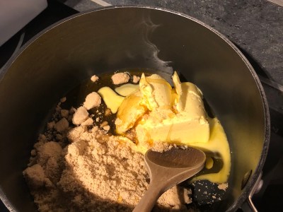 - Put the butter or margarine, sugar and syrup into a pan and over a gentle heat melt them altogether, stir to make sure it mixes well and does not burn.
