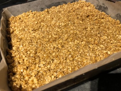 - Tip the mixture into the greased tin and flatten out the oats with the back of a spoon until flat and spread evenly. Put into the oven for 15 minutes until golden brown.