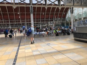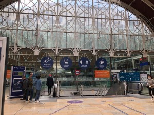 Our platform went up and everyone smoothly and distanced pasted through the barriers, all very civilised. We walked down to the last carriage which was quiet but by the time the train left was quite busy. Not a seat free around us. It was lots of people travelling together so they want to sit with each other. But everyone does seem to have their mask on, which is compulsory. No one walked through the train to check, so how is this being policed?